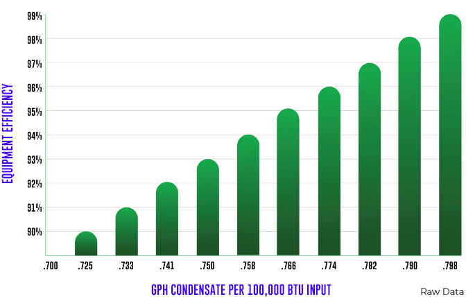 This is the fundamental factor to consider when sizing a neutralizer. JJM™ products are rated according to BTU capacity and the resulting gallons per hour (GPH) of condensate produced by the appliance(s). The guide below provides the estimated condensate produced based on an appliance’s efficiency and BTU input. As efficiency and heating input capacity increases so does the condensate produced.